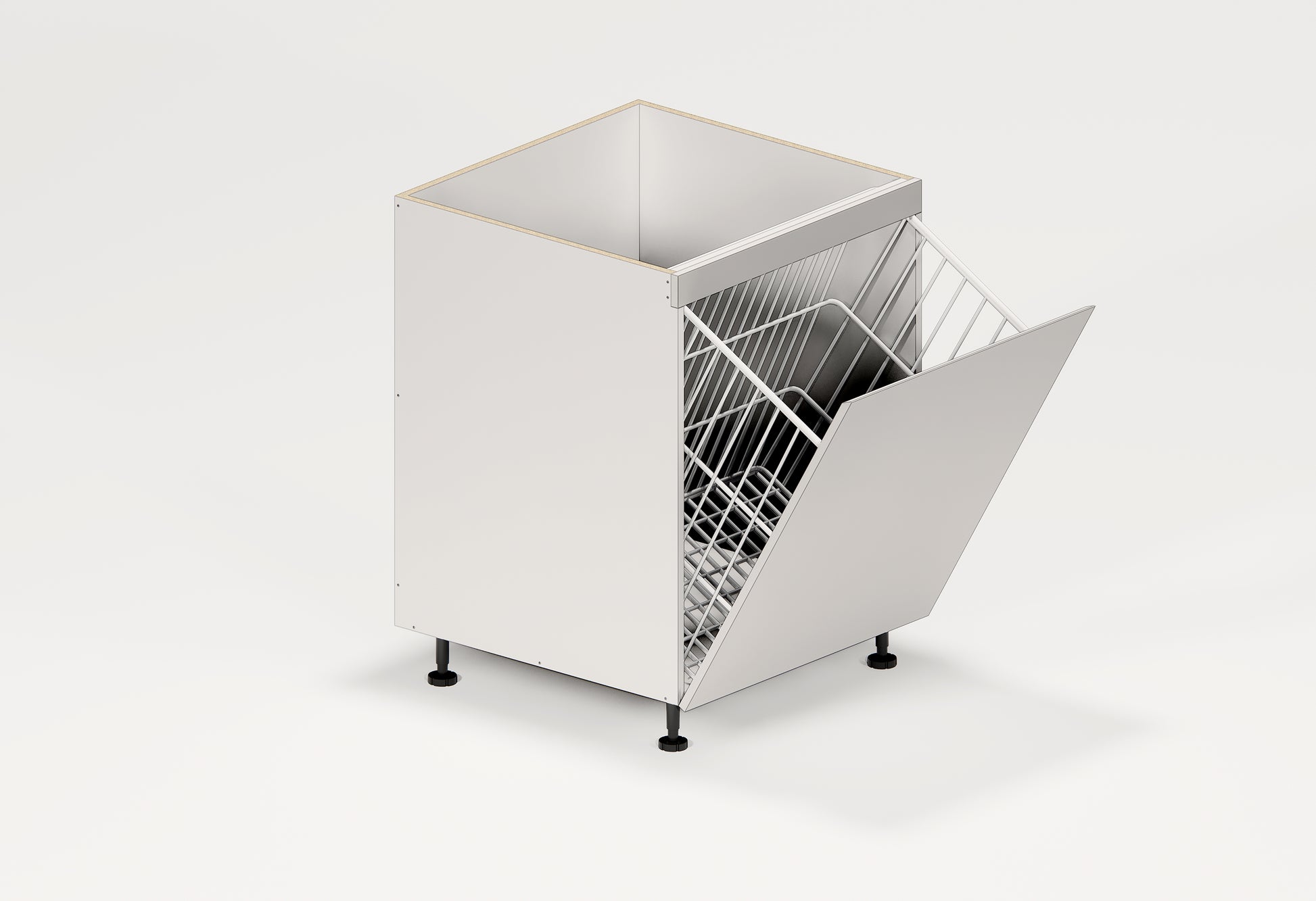 - This cabinet features a tilt-out laundry basket. With its clean and simple shape, it fits most home decor beautifully.