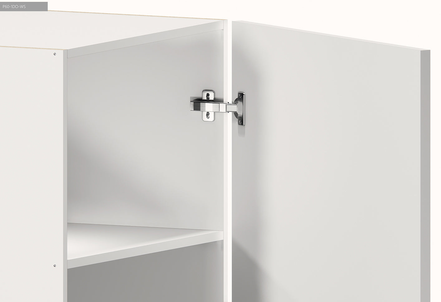 - Door: Fibreboard, Plastic edging, Polyurathane White Satin Flat.